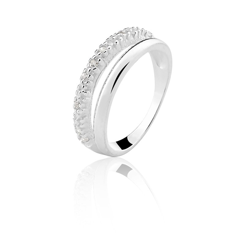 A prata trabalhada adiciona uma dimensão artesanal, criando um contraste fascinante com as pedras de zircônia que capturam a luz de maneira espetacular. O fio liso que envolve as pedras adiciona um toque de sofisticação minimalista. Versátil e deslumbrante, este anel é o complemento perfeito para qualquer look, desde o casual chique até o glamour sofisticado.