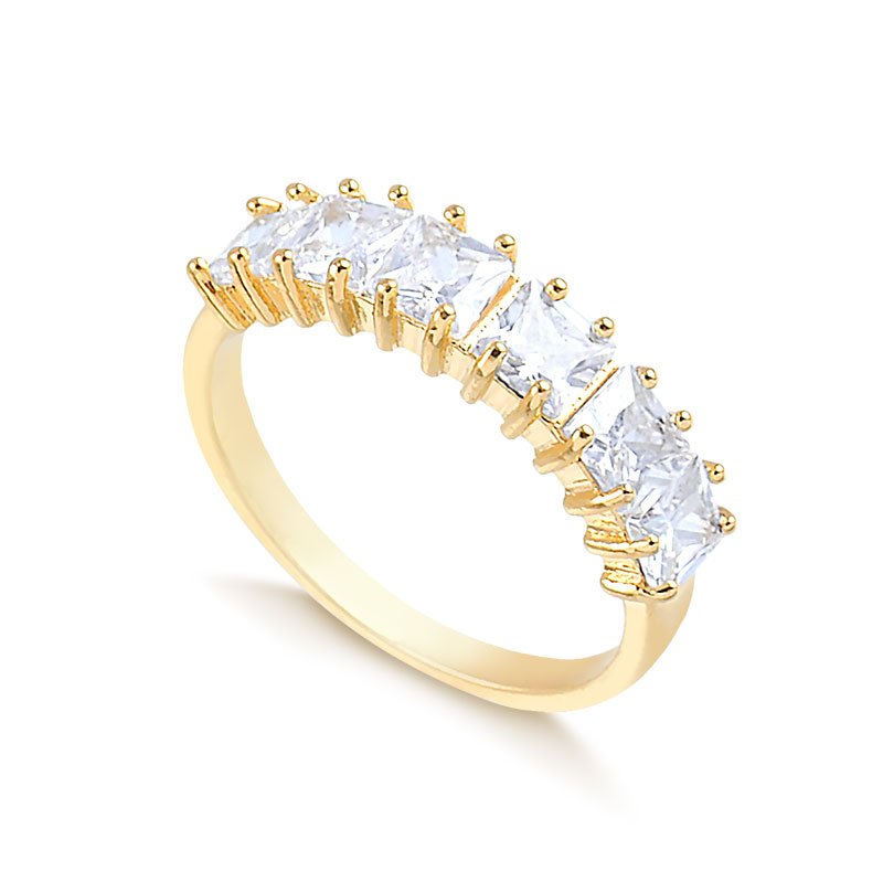 Anel Meia Aliança Banhada a Ouro 18k Com 6 Pedras de Zircônia Formato Quadrado