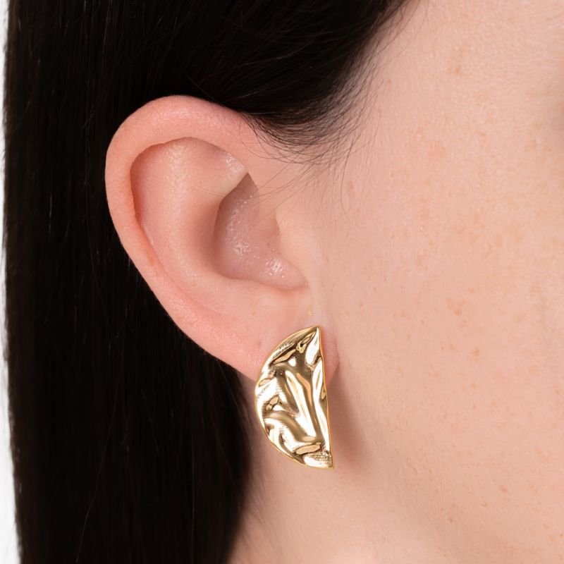 Autêntico, leve e cheio de estilo! Este brinco pequeno com banho de ouro 18k traz um design moderno em forma de meia lua chapada, com acabamento amassado que confere textura e personalidade à peça.